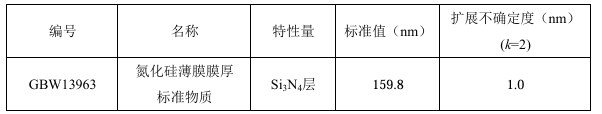外包装为铝箔真空袋,每包装为一片,20 mm乘以20 mm采用纳米薄膜厚度校准装置([2014]国量标计证字第273号)对标准物质定值。该校准装置基于布拉格方程,通过波长、角度测量的计量溯源,建立标准物质特性量值的计量溯源性,其中:角度测量量值通过激光干涉仪和自准直仪溯源至国家角度基准:X射线波长测量量值通过单品硅晶格参数溯源至长度的SI单位-米(m)。特性量值及不确定度如下: