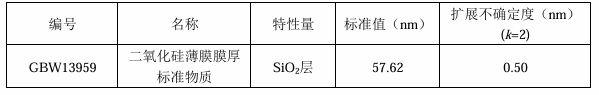 外包装为铝箔真空袋,每包装为一片,20 mm乘以20 mm采用掠入射X射线反射技术为样品定值,此设备为计量校准装置,角度源至多齿分度台标准装置,入射光波长溯源至单晶硅晶格参数。通过使用满足计量学特性要求的测量方法和计量器具保证其量值溯源性。特性量值及不确定度如下: